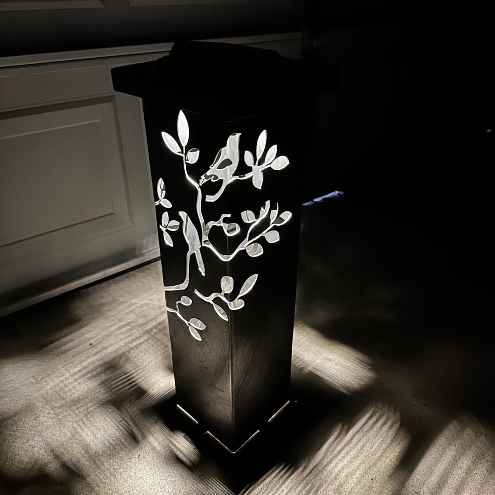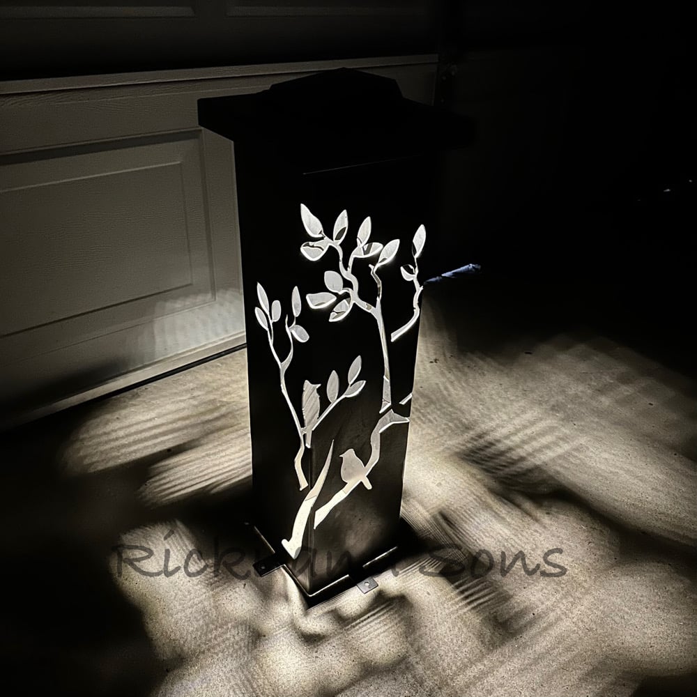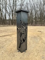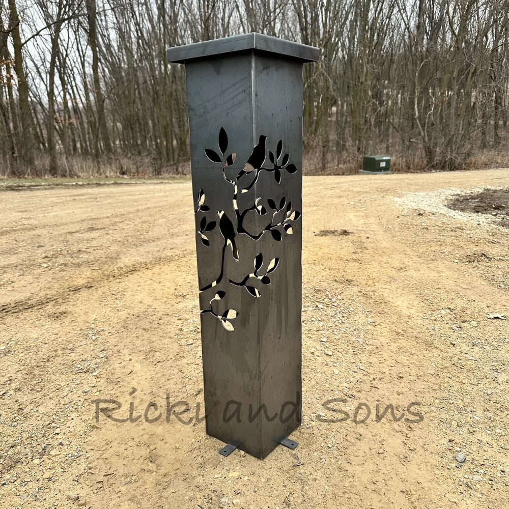 These plasma cut Garden Pillars with a Birds and Branches Pattern are made from 14 gauge steel. Ready to stake in the ground in your garden or yard. Secure in the ground using large nails or ground stakes (not included). This item is raw steel with no finish, so it WILL rust over time.