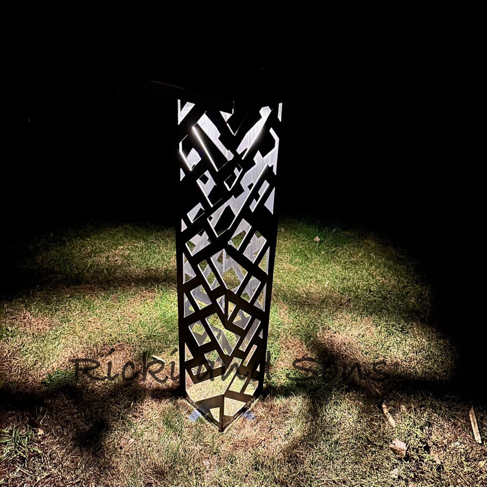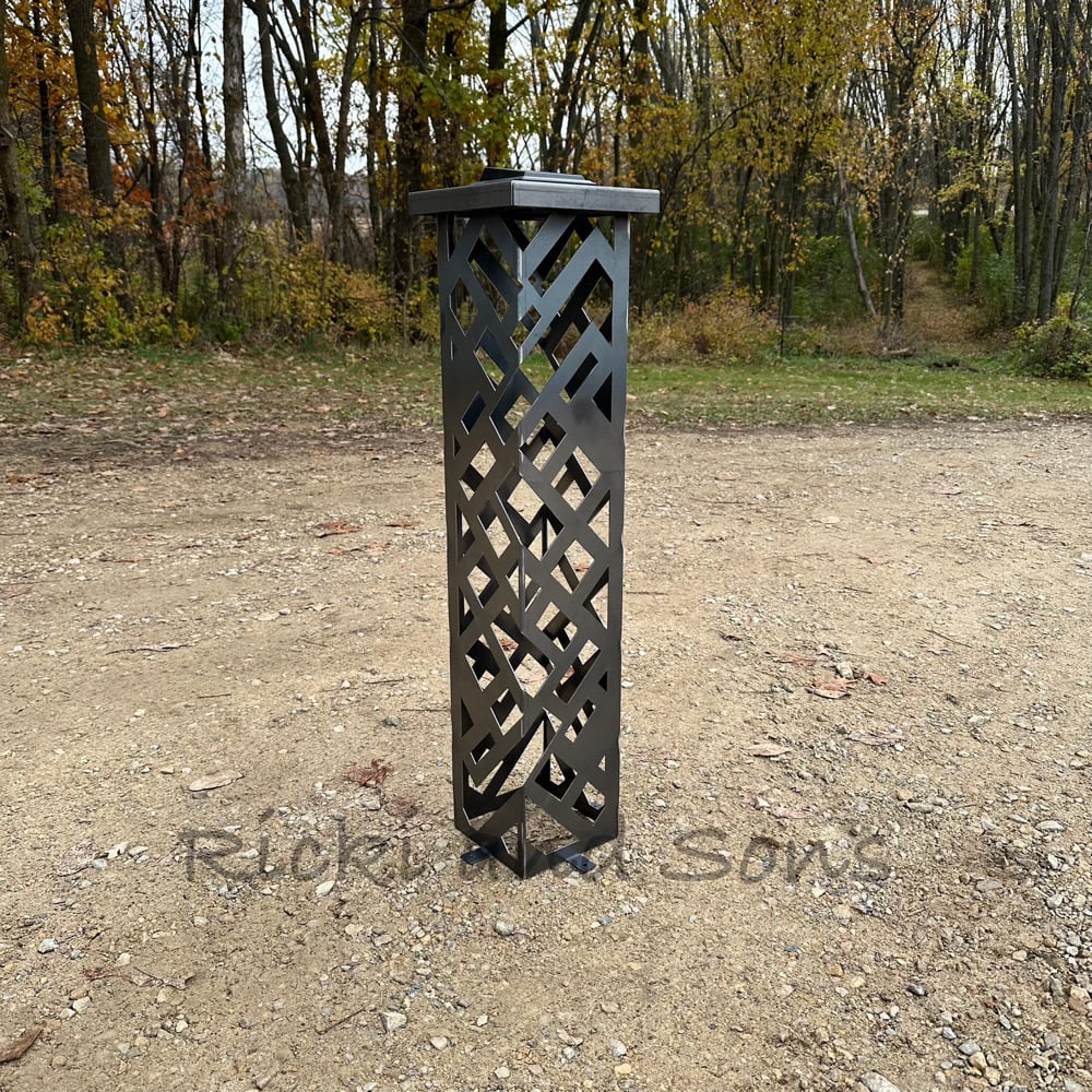 These plasma cut Garden Pillars with a Intersecting/Crossed Lines Pattern are made from 14 gauge steel. Ready to stake in the ground in your garden or yard. Secure in the ground using large nails or ground stakes (not included). This item is raw steel with no finish, so it WILL rust over time.