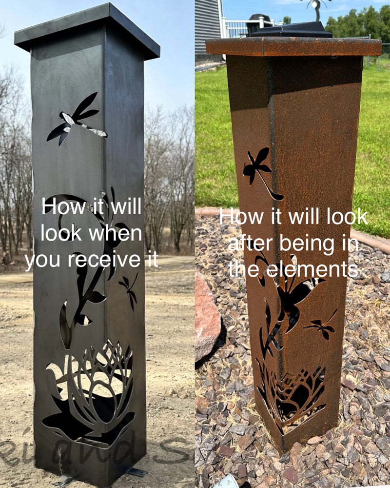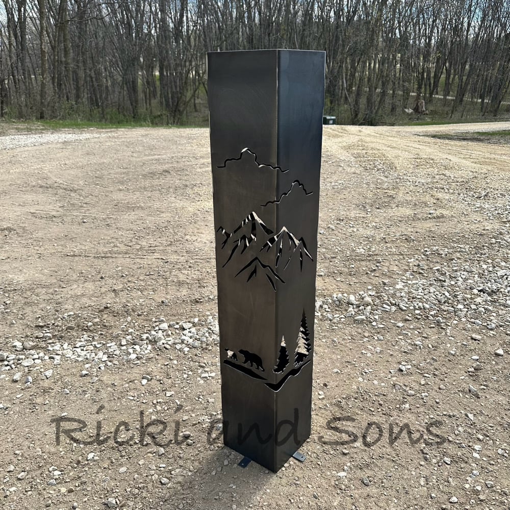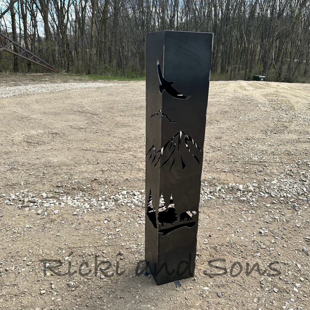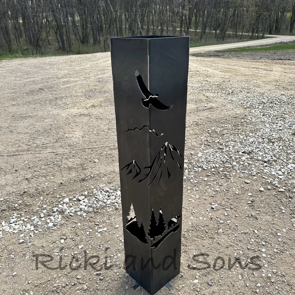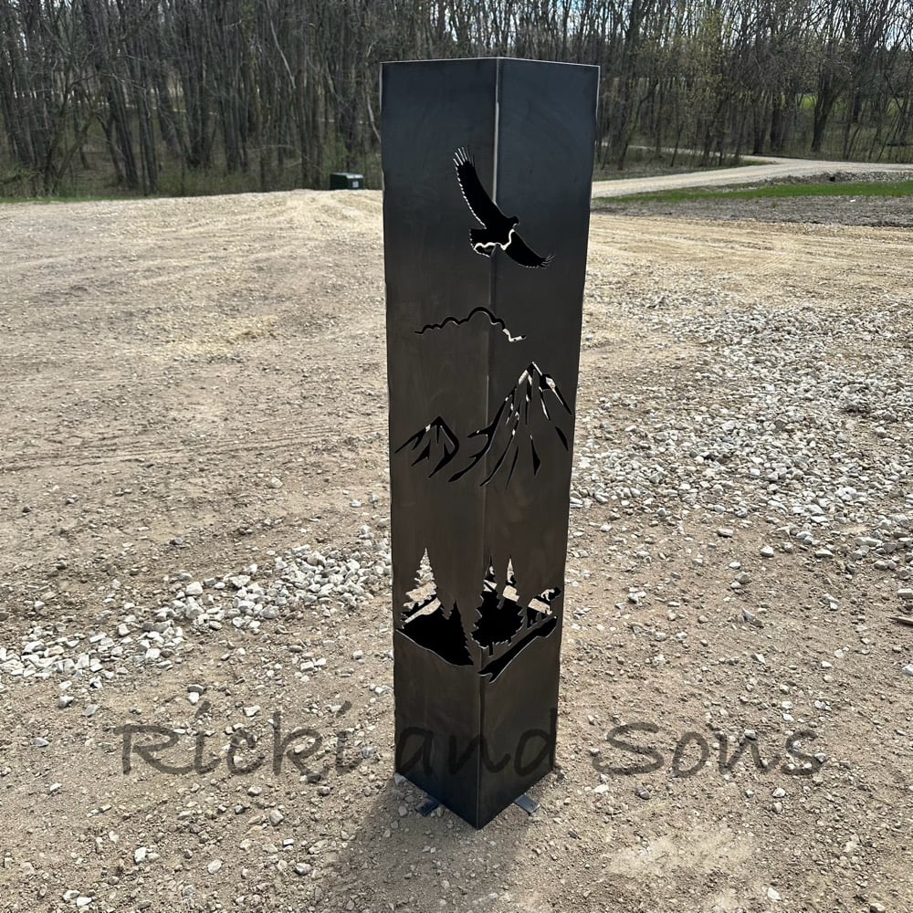 These plasma cut Garden Pillars with a Mountain Scene/Bear Eagle Pattern are made from 14 gauge steel. Ready to stake in the ground in your garden or yard. Secure in the ground using large nails or ground stakes (not included). This item is raw steel with no finish, so it WILL rust over time.