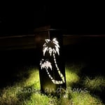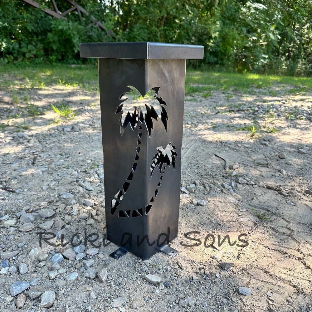 These plasma cut Garden Pillars with a Palm Tree Pattern are made from 14 gauge steel. Ready to stake in the ground in your garden or yard. Secure in the ground using large nails or ground stakes (not included). This item is raw steel with no finish, so it WILL rust over time.