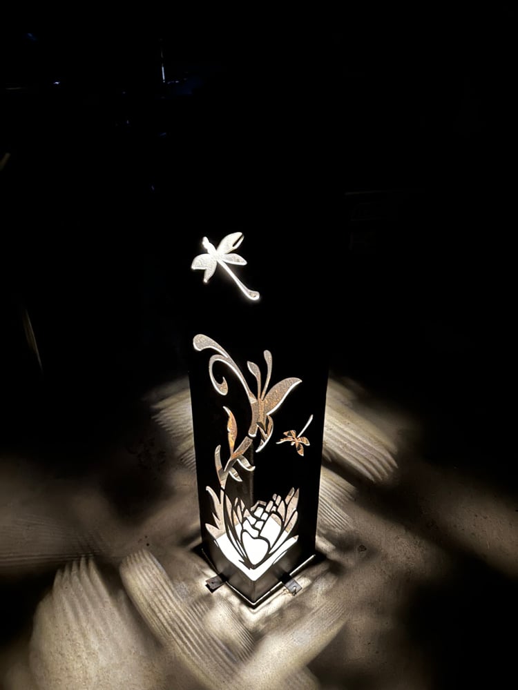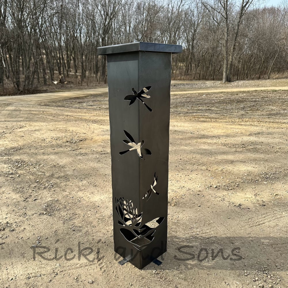 These plasma cut Garden Pillars with a Water Lily & Dragon Flies Pattern are made from 14 gauge steel. Ready to stake in the ground in your garden or yard. Secure in the ground using large nails or ground stakes (not included). This item is raw steel with no finish, so it WILL rust over time.